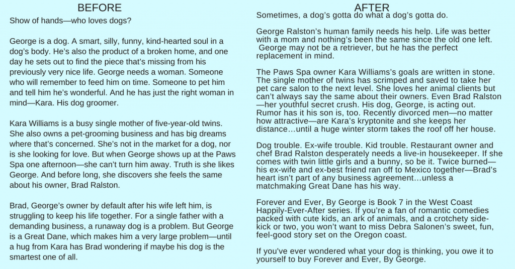 And here is the BEFORE and AFTER version of my blurb for Forever and Ever, By George. I think this cover is one of my favorites!