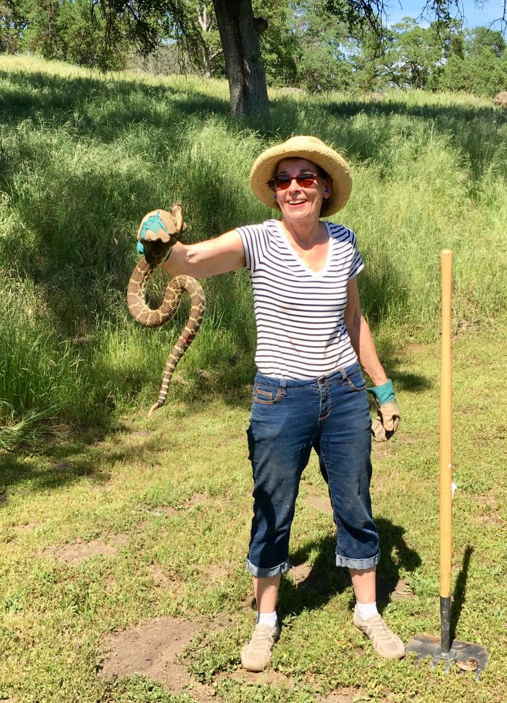 I chopped off its head and carried it back to the fire. When I shared this photo with my son and daughter (their children walk this path every day), my son texted back: “You are one badass country mom.”
